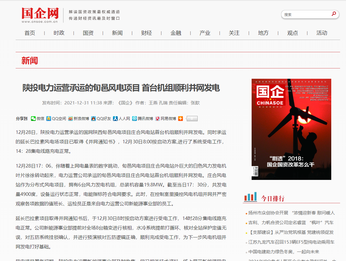 国企网:陕投电力运营承运的首台风电机组顺利并网发电