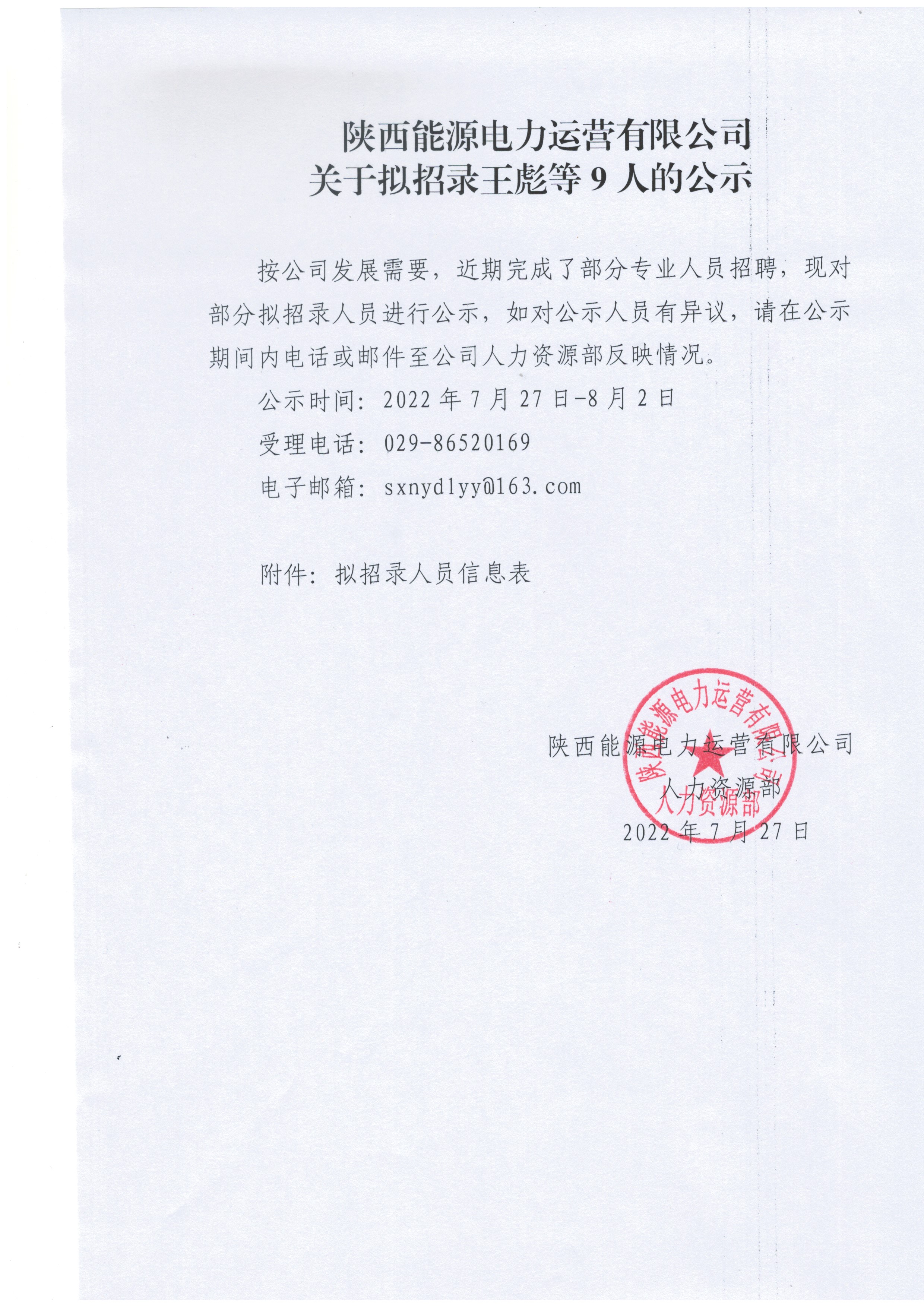陕西能源电力运营有限公司关于拟招录王彪等9人的公示