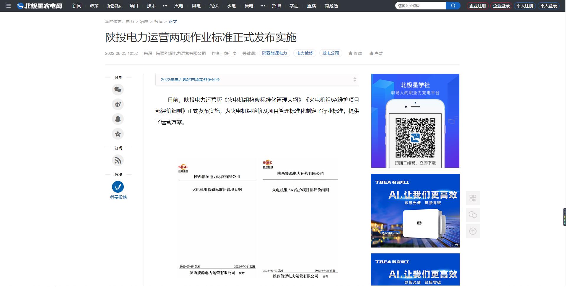 北极星电力网:陕投电力运营两项作业标准正式发布实施