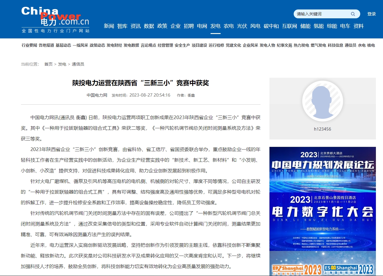 中国电力网:陕投电力运营在陕西省“三新三小”竞赛中获奖