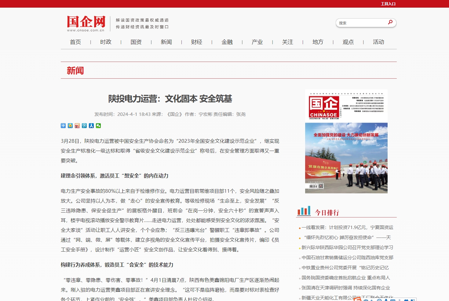 🗹    3月28日,陕投电力运营被中国安全生产协会命名为“2023年全国安全文化建设示范企业”,继实现安全生产标准化一级达标和取得“省级安全文化建设示范企业”称号后,在安全管理方面取得又一重要突破。