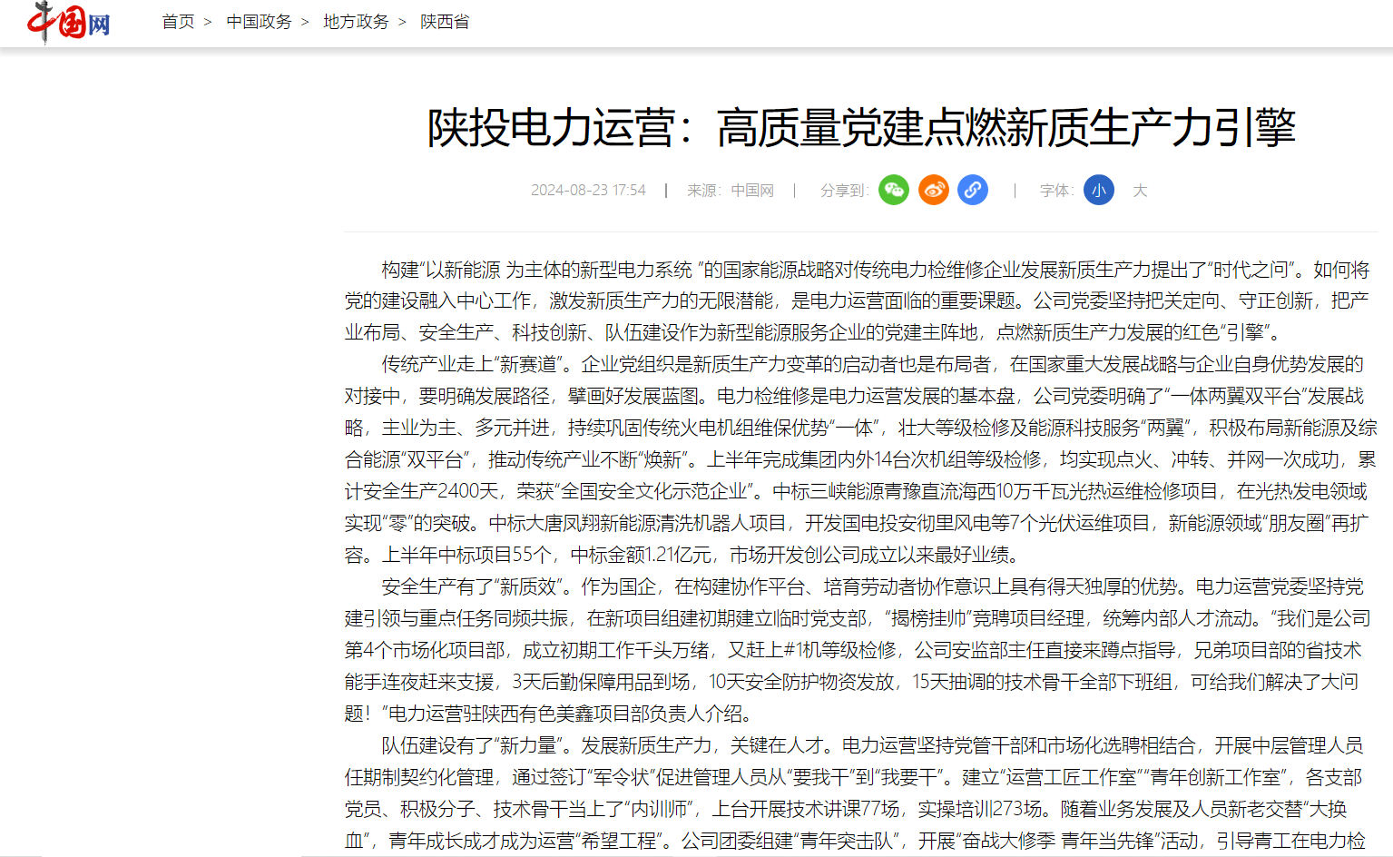 中国网:陕投电力运营高质量党建点燃新质生产力引擎