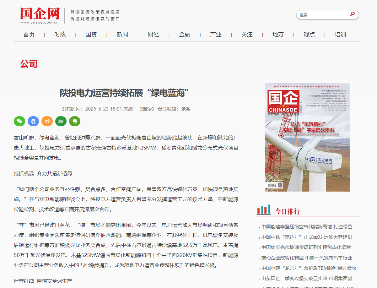 国企网:陕投电力运营持续拓展“绿电蓝海”