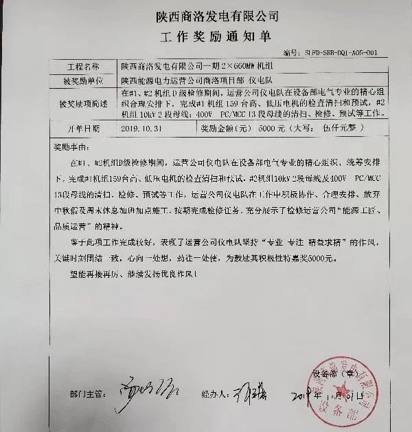 🃏 1一月6日,商洛业务部接寄来商洛并网发电本职事情赠送制度5零元,以嘉奖仪电队在最进加班加一点加一点进行#1汽轮发电机的159台电机的,#2汽轮发电机的10kV2段母线修检和预试等本职事情。这也是19年近些年,业务部继电炉班顺遂结束湿法脱硫整体更新改造途径,赠送制度5零元;汽化热水班如约进行#1汽轮发电机的主汽阀、调阀拆除,赠送制度3零元;电炉班副组长李海峰发现#2炉雷韵油冷壁窃取根本性障碍,赠送制度一个人2零元后,接寄来的第四个笔车主方本职事情赠送制度。