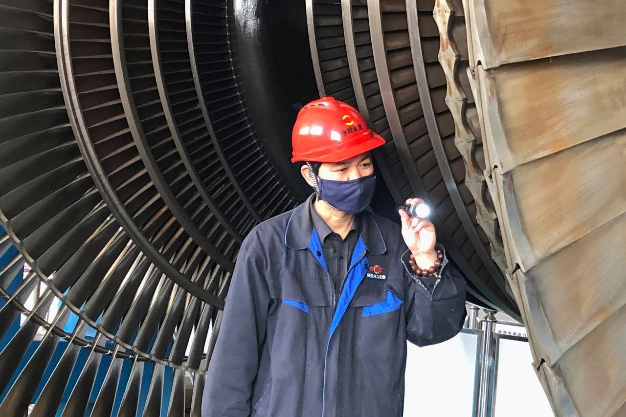 6月13日,渭河大型工程项目机务队电脑主机班詹泾永在定期检查汽轮发电机组叶面